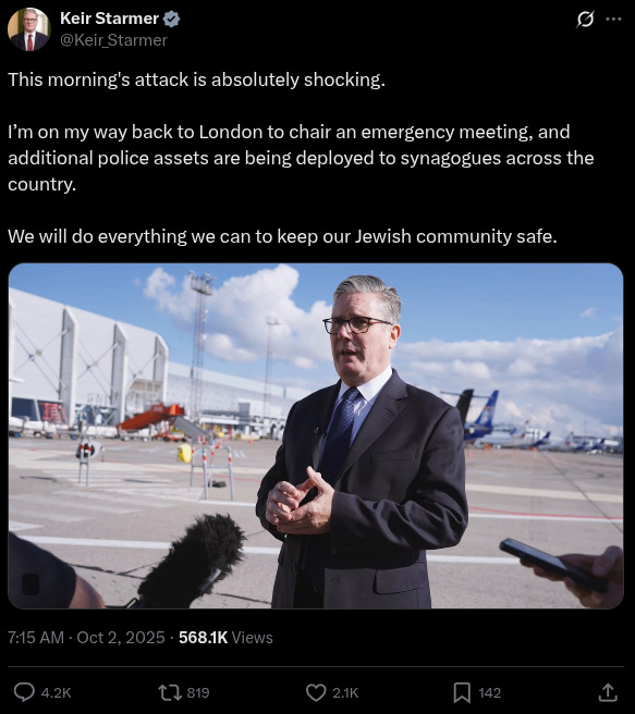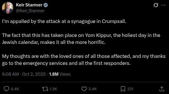 “I’m appalled by the attack at a synagogue in Crumpsall,” Starmer said.
