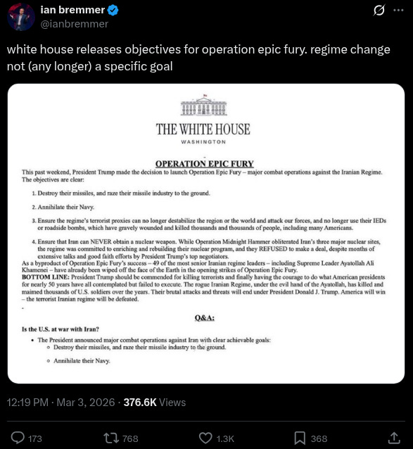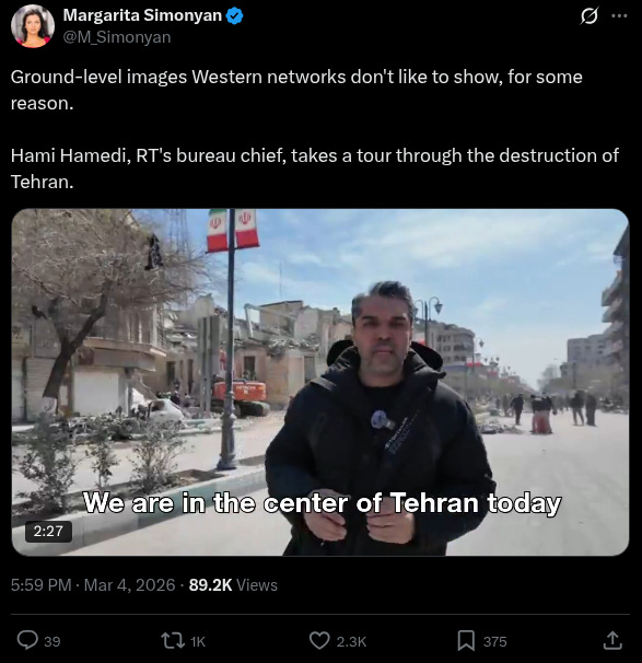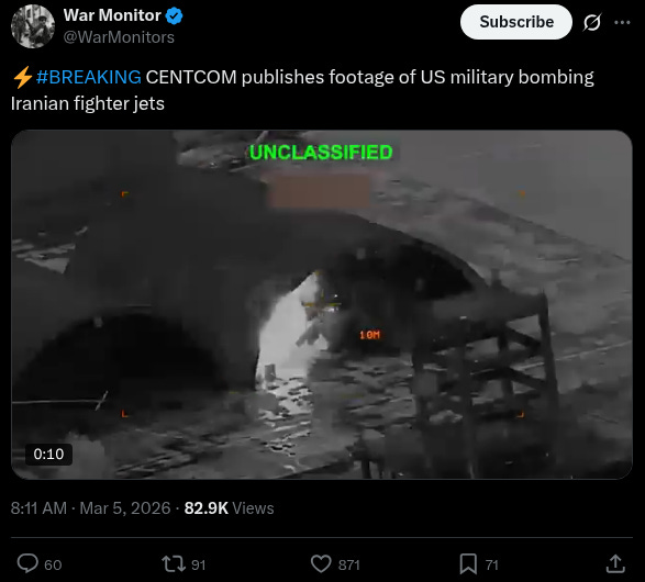This question of whether US allies will jump in remains an open one. Prior precedents of American Middle East adventurism suggests it’s only a matter of time, and we are seeing the proverbial camel’s nose under the tent. Another excample: Canadian Prime Minister Mark Carney said he “can never categorically rule out participation” in the US-Israeli war with Iran after previously saying Canada would not take part.