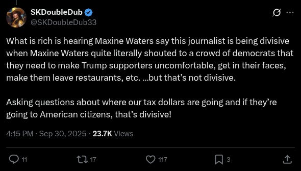 When asked if she was good with the government shutdown, Waters got irritated, “You keep – that’s what you’re pushing on…you’re standing here and you’re trying to make me say that somehow we’re going to put non-citizens over Americans. Quit it. Stop it. This is the kind of journalism we don’t need.”