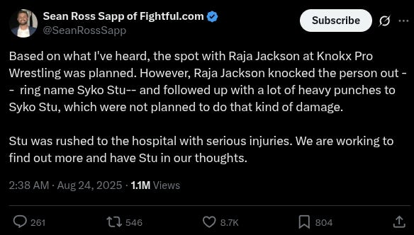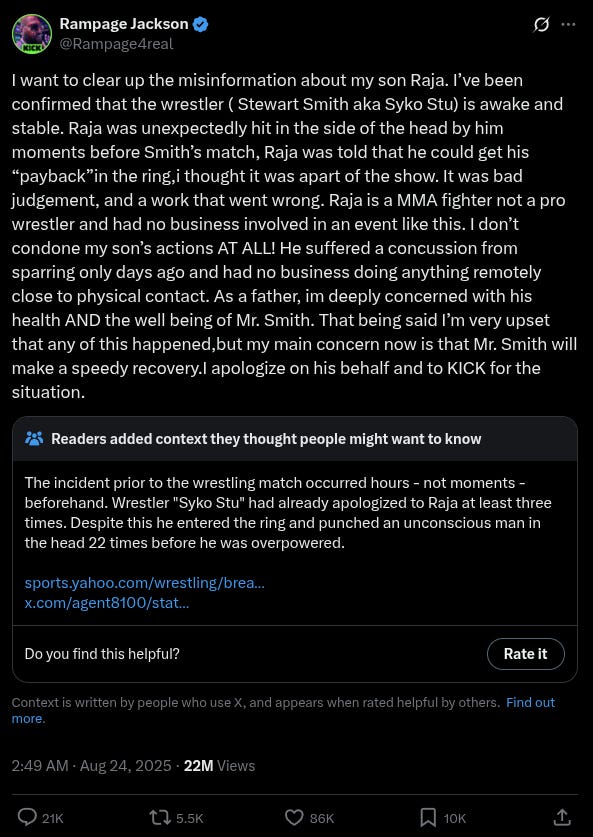 Quinton “Rampage” Jackson issued a statement on X emphasizing that his son had suffered a concussion days prior and “had no business” participating. He called Raja’s actions “bad judgment” and “a work that went wrong,” and expressed concern for both his son and Syko Stu’s well‑being and recovery.
