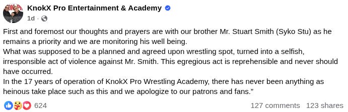 In the 17 years of operation of KnokX Pro Wrestling Academy, there has never been anything as heinous take place such as this and we apologize to our patrons and fans.”