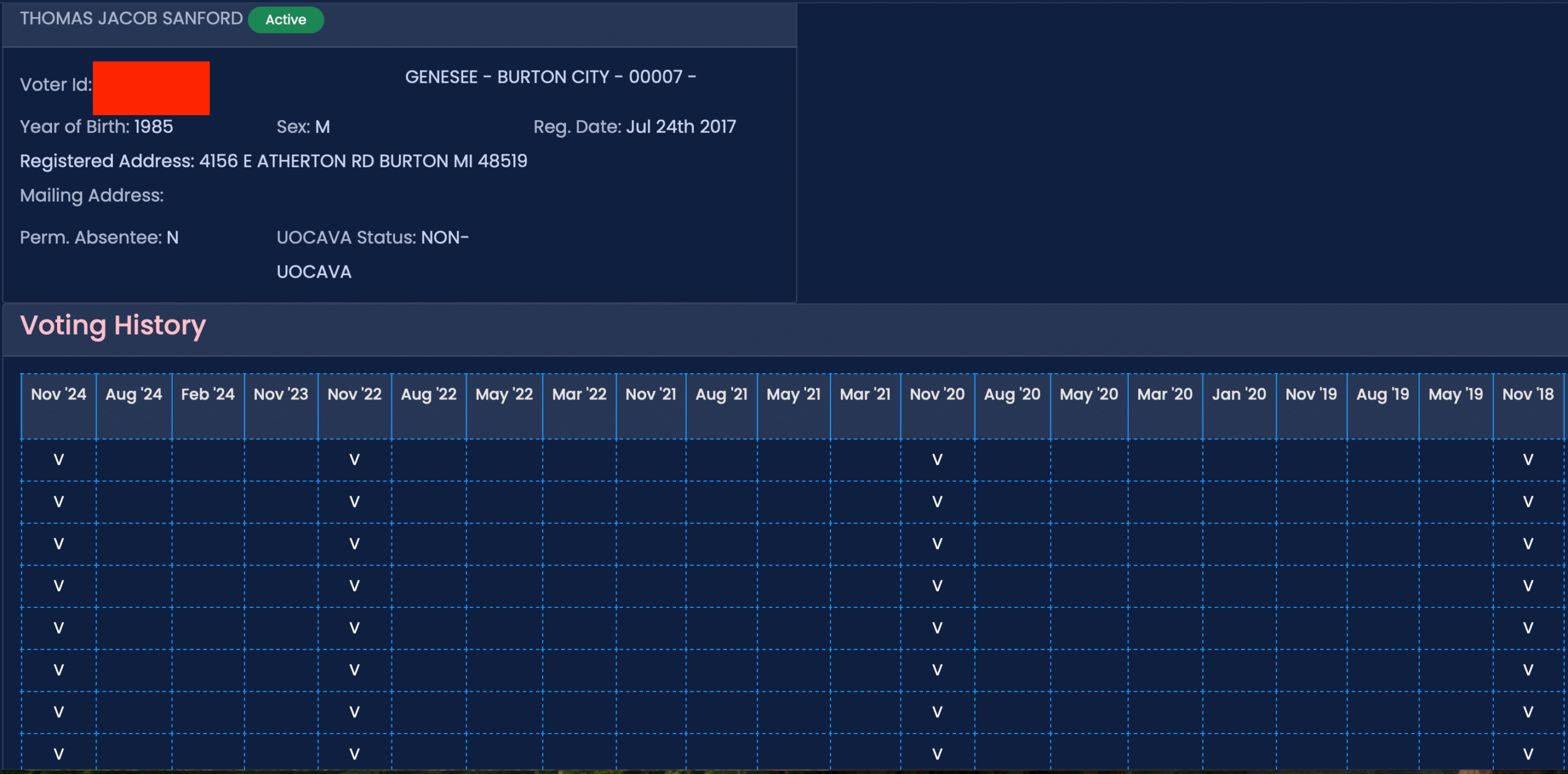 The Gateway Pundit looked up the alleged shooter’s home address and found a Trump-Vance sign wedged behind a STOP sign on what appears to be his property, according to records. We verified his address on SmartBackgroundCheck.com and CheckMyVote.org, where we were able to view his voting record. It appears that the alleged shooter registered to vote in the 2018 midterms following Trump’s first presidential election victory in 2016.