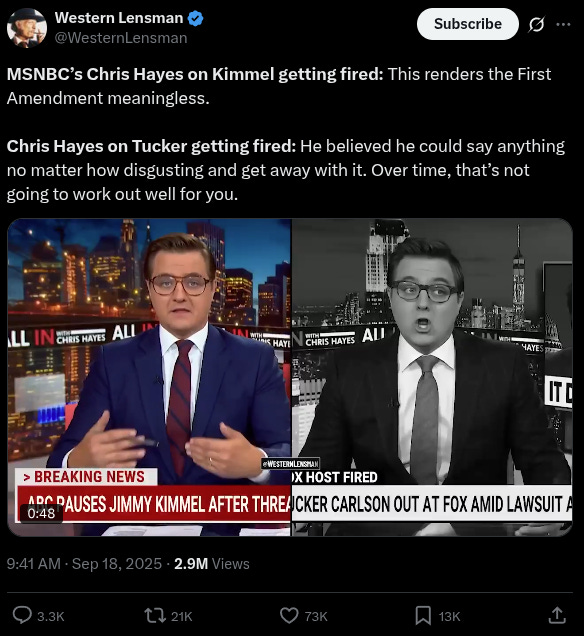 The left, which routinely relies on falsehoods to push coordinated narratives, freaked out in response - with pissy Reddit NPCs canceling their Disney subscriptions and whining about 'muh free speech.' And it's no wonder, as leftist talking heads such as MSNBC's Chris Hayes tell their audience all about the rage they should feel over Kimmel's ouster.