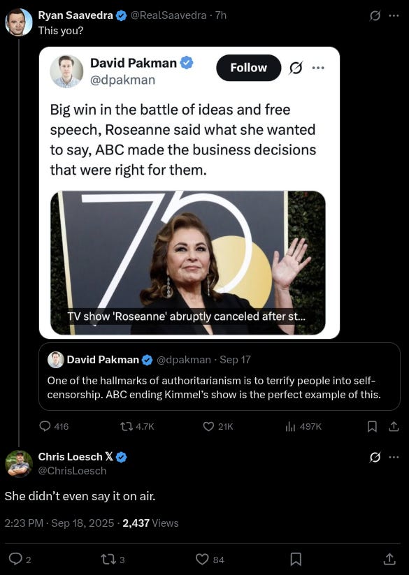 When it was Kimmel: "This is just the latest chapter in Donald Trump's ongoing campaign to crack down on free speech, dominate the media, and essentially render the First Amendment meaningless.