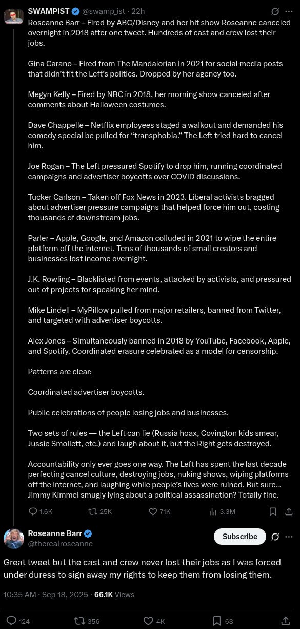 Accountability only ever goes one way. The Left has spent the last decade perfecting cancel culture, destroying jobs, nuking shows, wiping platforms off the internet, and laughing while people’s lives were ruined. But sure… Jimmy Kimmel smugly lying about a political assassination? Totally fine.