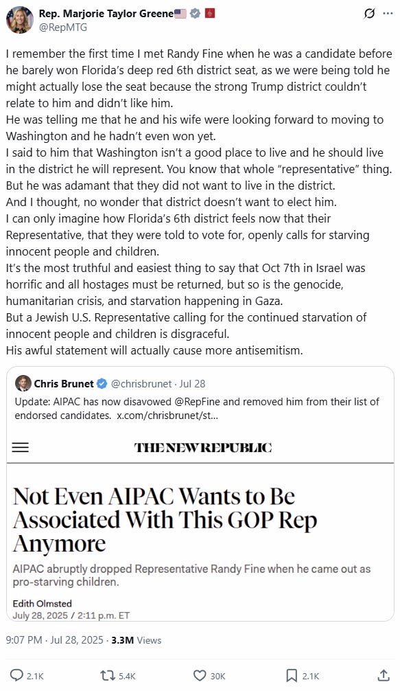 Greene made the comments in response to the news that the pro-Israel lobby AIPAC has dropped Rep. Randy Fine (R-FL) from its list of pro-Israel candidates after he said Palestinians in Gaza should “starve away” amid news of rising malnutrition deaths due to the Israeli siege. AIPAC later downplayed Fine‘s removal from the list, saying they would consider his potential endorsement later in the election cycle.