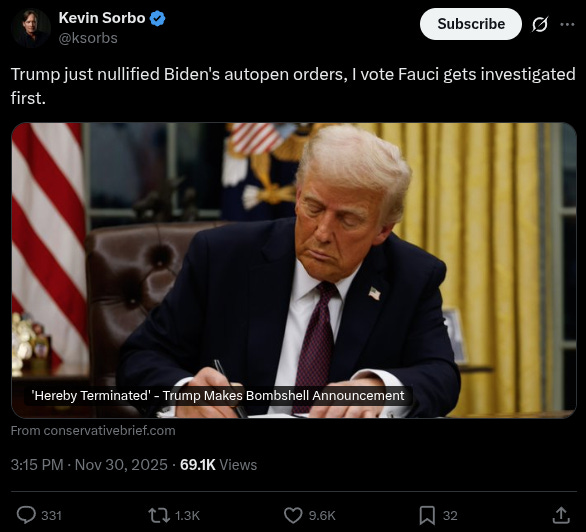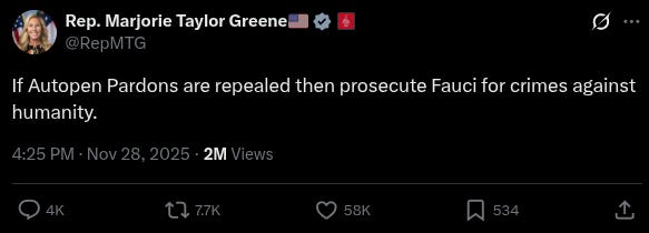“If Autopen Pardons are repealed then prosecute Fauci for crimes against humanity,” Rep. MTG posted to X on Saturday.