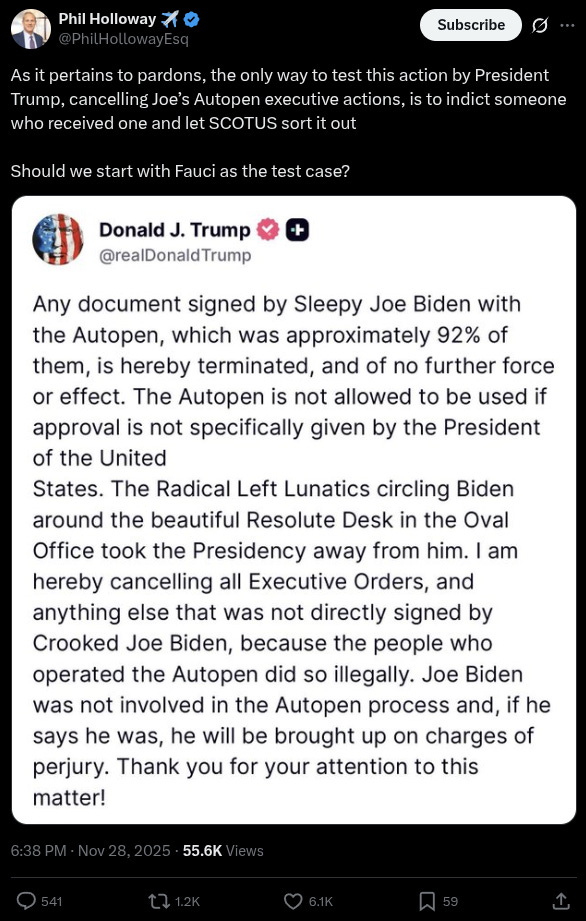 Rep. Greene’s suggestion came as Trump made major news over the Thanksgiving holiday by declaring Biden’s pardons signed by an autopen device “terminated.”
