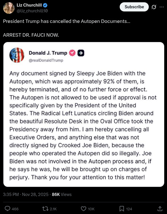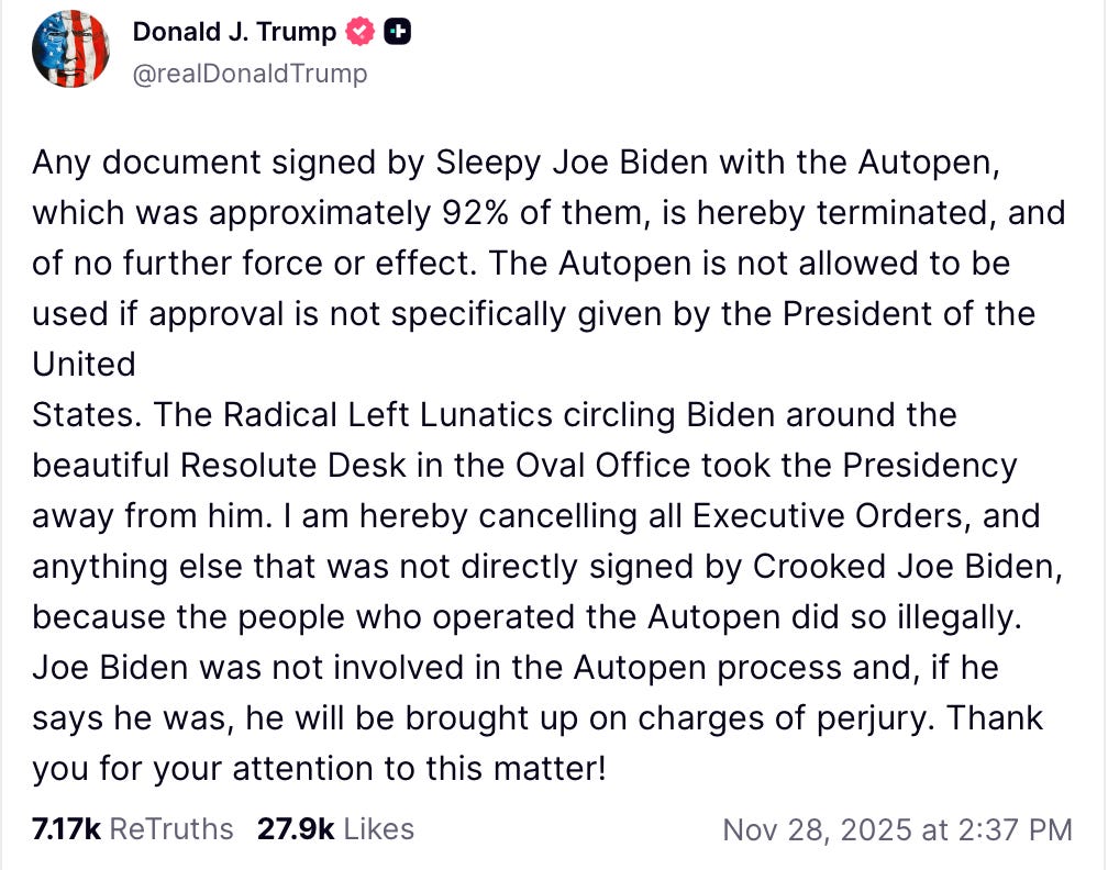 “Any document signed by Sleepy Joe Biden with the Autopen, which was approximately 92% of them, is hereby terminated, and of no further force or effect,” Trump wrote on Friday. “The Autopen is not allowed to be used if approval is not specifically given by the President of the United States.”