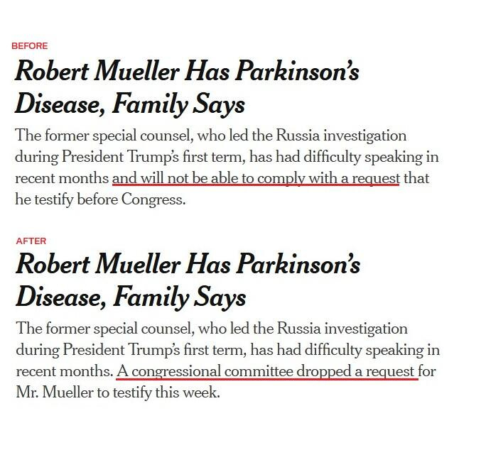 Former FBI Director and Trump special counsel Robert Mueller claims he has Parkinson's disease, and "cannot comply with a request to testify this week before a congressional committee investigating the government's handling of the Jeffrey Epstein investigations," the NY Times originally reported Sunday evening before stealth-editing their article to lead with the committee having withdrawn their request.