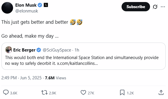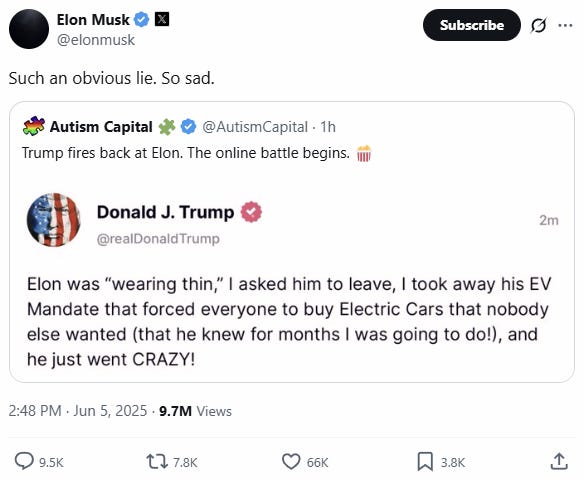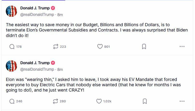 Trump then 'truthed' that "The easiest way to save money in our Budget, Billions and Billions of Dollars, is to terminate Elon’s Governmental Subsidies and Contracts. I was always surprised that Biden didn’t do it!"