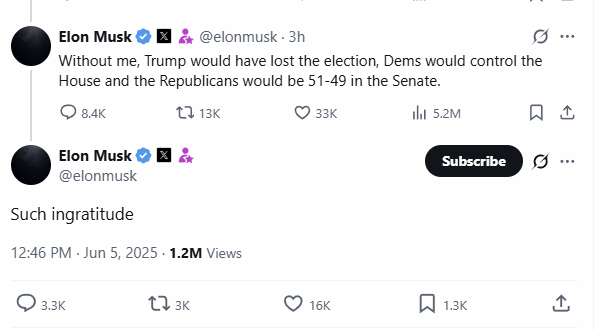 Elon Musk is now raging on X against President Trump, after Trump talked greasy to the press over Musk's opposition to the "Big Beautiful Bill" over the past several days.