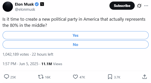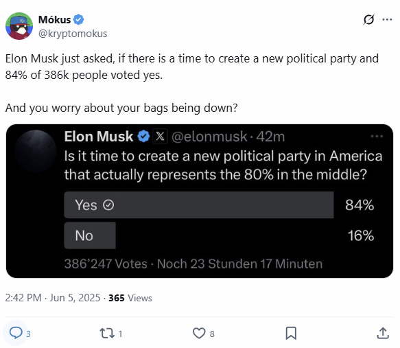 Update (1255ET): The tech-bro industrial complex has to be shitting themselves as the Trump-Musk spat just hit a new gear; Elon Musk is calling for a new political party, while Trump just threatened to pull Musk's contracts.
