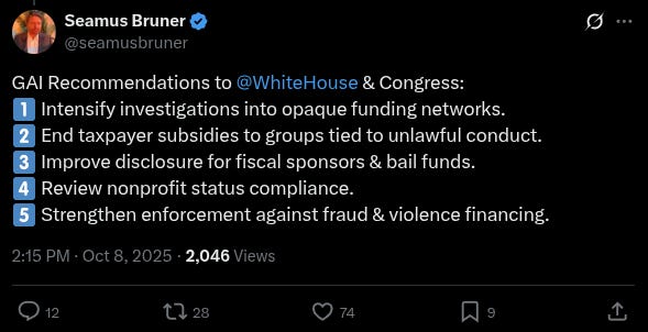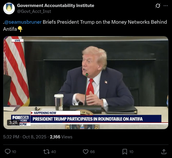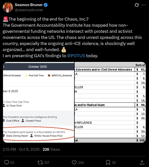 “I think we know that this is not just a story about violence and chaos … this is a money story,” Bruner told President Trump. “And at the Government Accountability Institute … we follow the money, and we followed it to the top of what we call the protest industrial complex.”