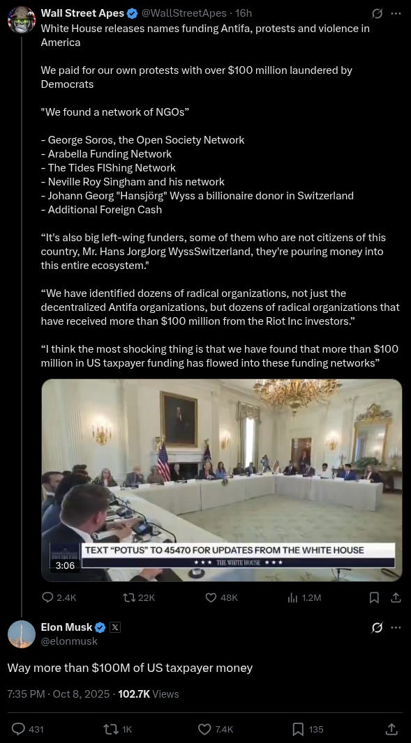 Musk: "Way More Than $100 Million" in U.S. Taxpayer Funds Funneled Into NGOs Fueling Antifa