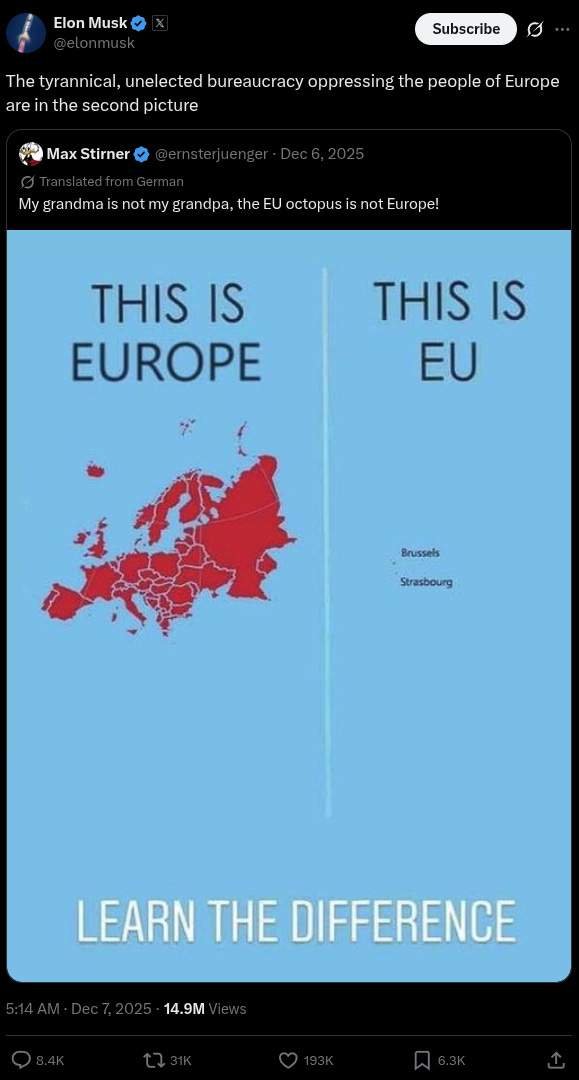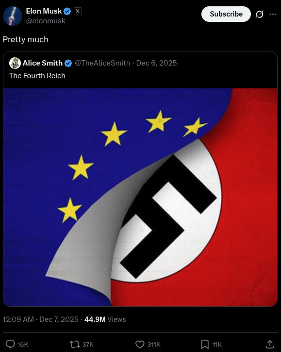 With President Trump and Musk now buddies again, we suspect the president will fire off a Truth Social post about Brussels bureaucrats, and Musk will be commenting on X.