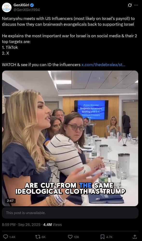 “What we have to do is secure that part of the base of our support in the United States, that is being challenged systematically … How do we fight back? Our influencers, I think you should also talk to them if you have the chance,” Netanyahu said.