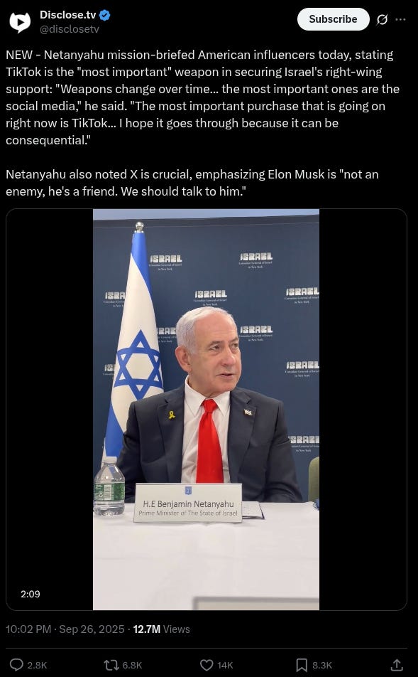 The Israeli leader described the TikTok plan as the “most important purchase that is going on.” Under the plan approved by President Trump, one of the companies that will have a major stake in TikTok and control the algorithm is Oracle, which is owned by Larry Ellison, an extremely pro-Israel billionaire and major private donor to the Israeli military.