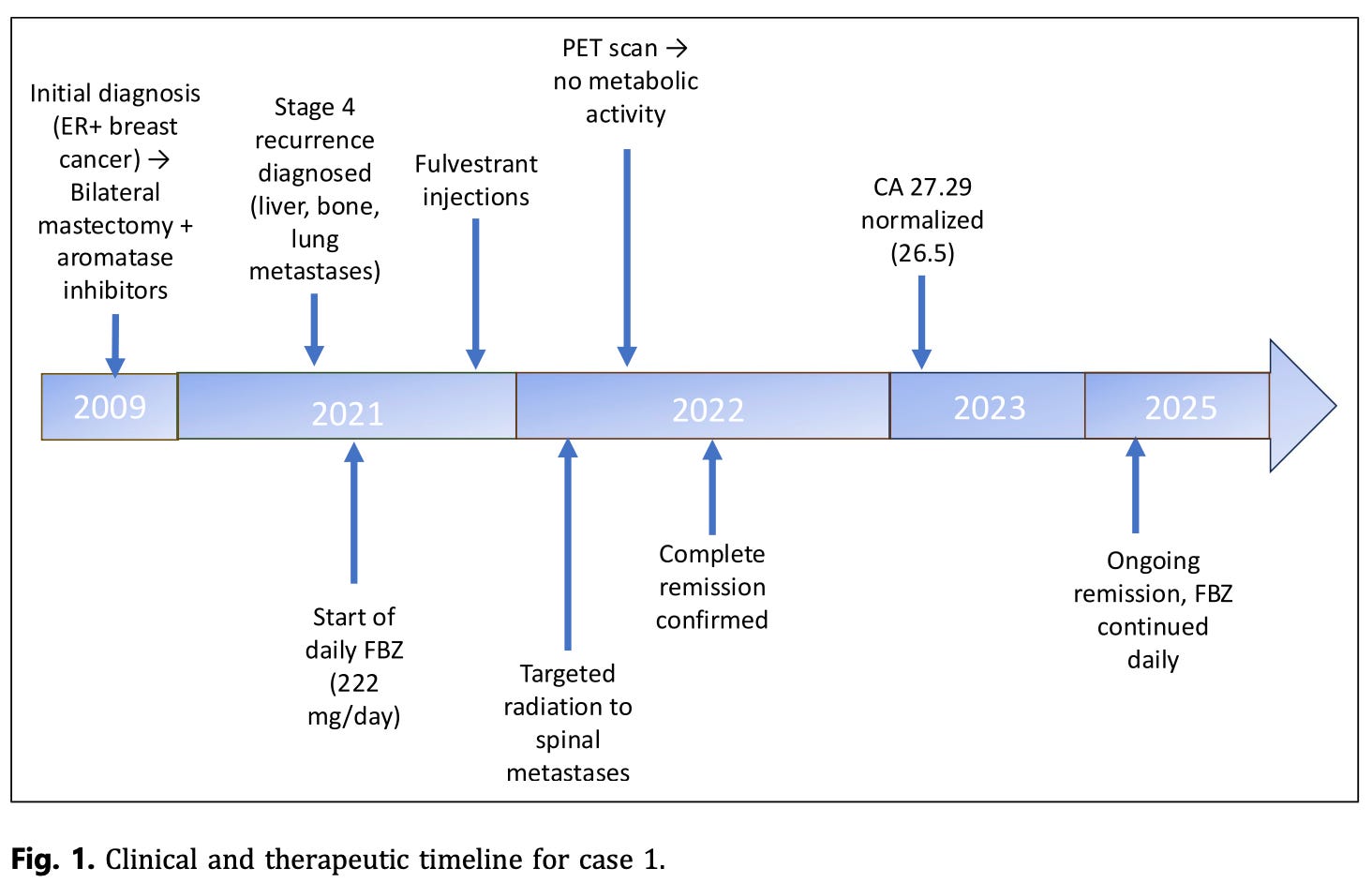 Treatment: Daily FBZ (222 mg), fulvestrant (estrogen blocker), brief targeted radiation for spinal lesions, vitamin D and multivitamins.