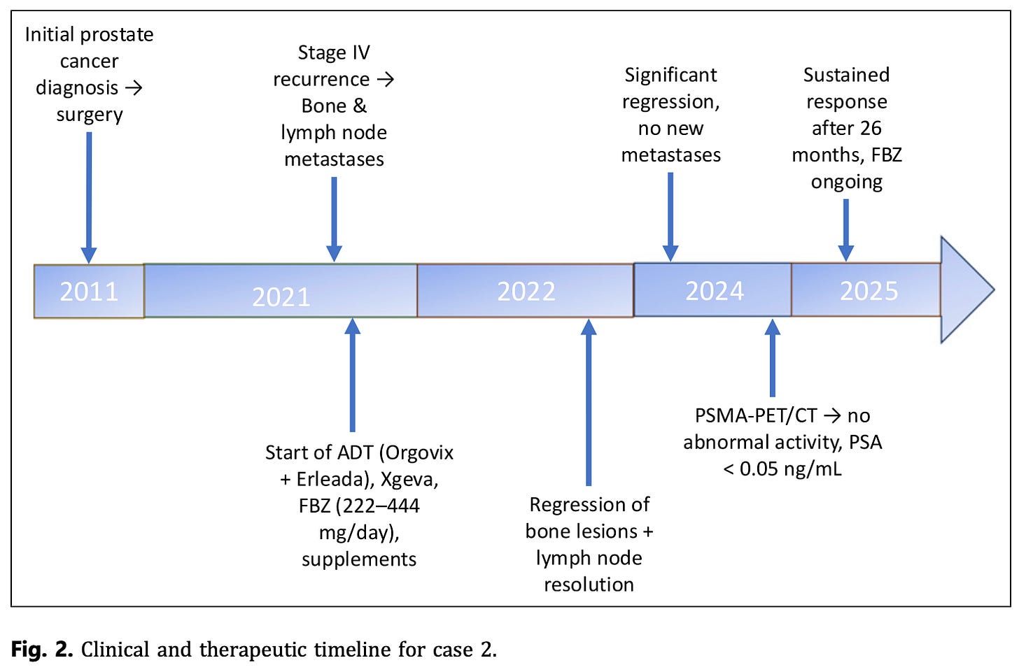 Treatment: Androgen deprivation therapy (Orgovix, Erleada, Xgeva) plus supplements (vitamin D/K2, melatonin, berberine, curcumin, artemisinin). Added FBZ 222–444 mg/day.