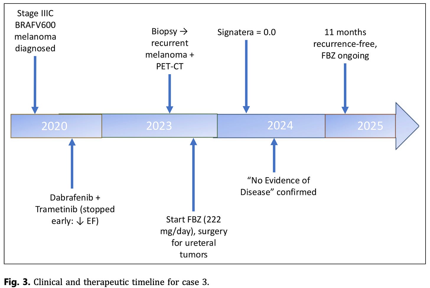 Outcome: Within 8 months, tumor markers normalized and PET scans confirmed no evidence of disease. She has remained recurrence-free for nearly 3 years on continued FBZ with no adverse effects.