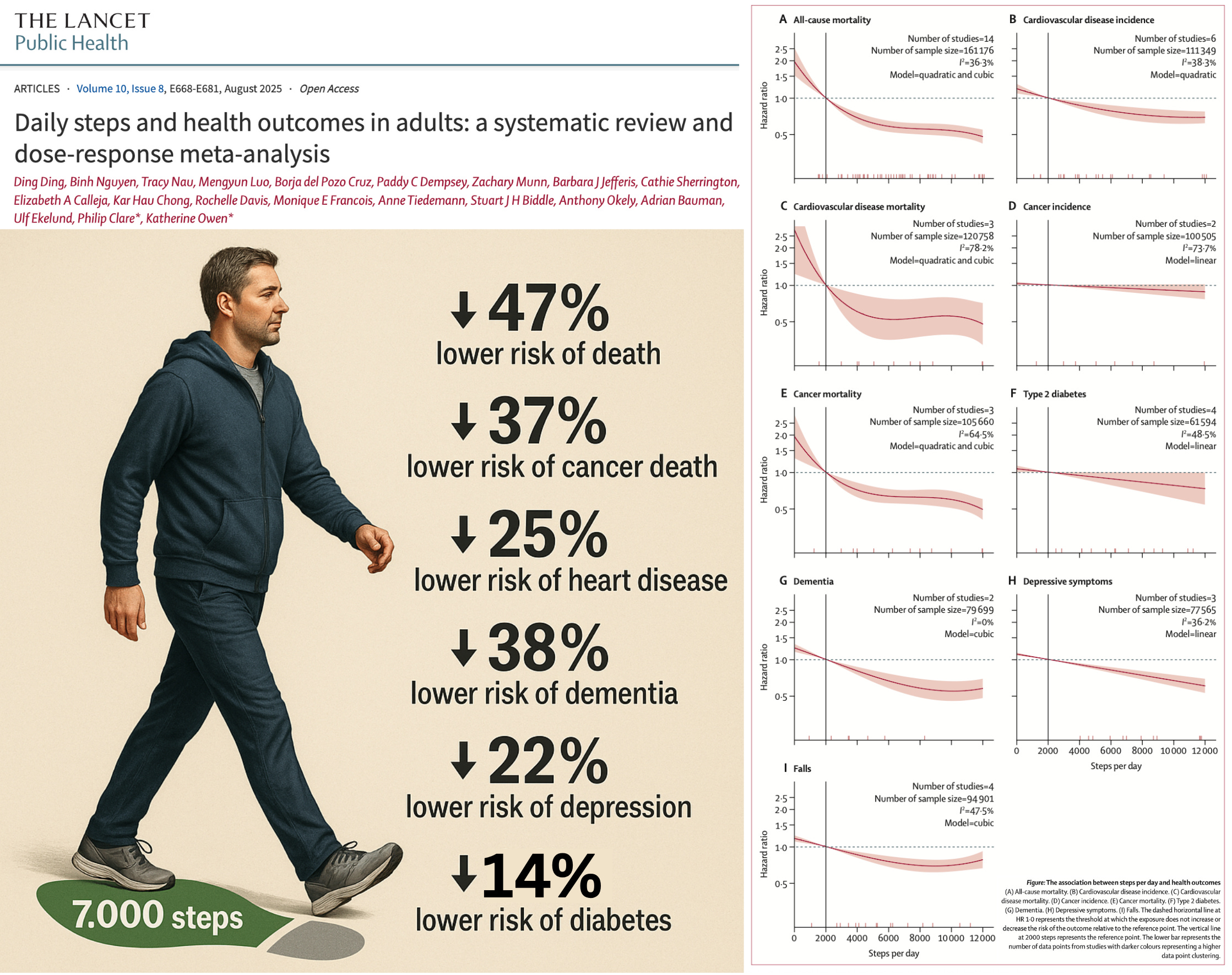 This largest and most comprehensive synthesis to date included meta‑analyses of data from 24 cohorts across eight major health outcomes, drawing from nearly one million participants worldwide. Researchers mapped the precise relationship between daily step counts and risks for all‑cause mortality, cardiovascular disease, cancer, type 2 diabetes, dementia, depression, and falls—making it the most detailed look yet at how walking impacts long‑term health.