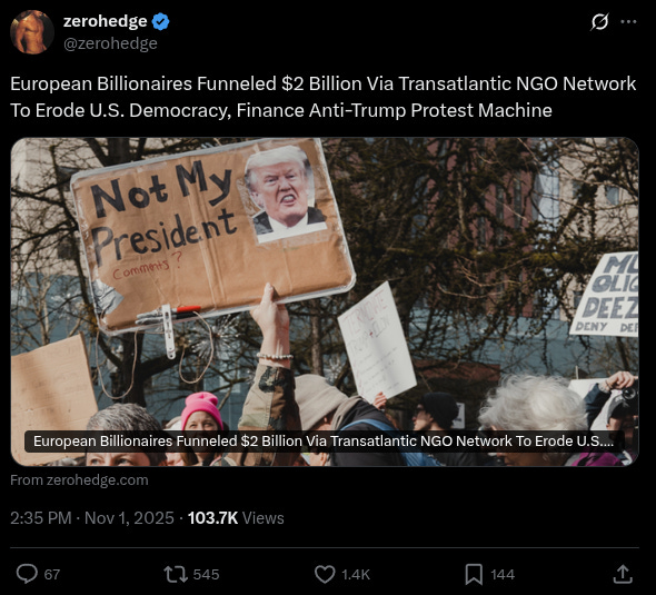 Long before the political assassination of Charlie Kirk, the protest-industrial complex, which fuels endless color-revolution-style operations against ‘MAGA’ and is bankrolled by billionaire-funded dark-money networks, declared war on President Trump and his supporters many years ago. It’s only now that the White House is beginning to understand the NGO beast and the funding webs that quite frankly want regime change - at any cost necessary.