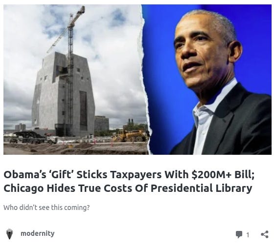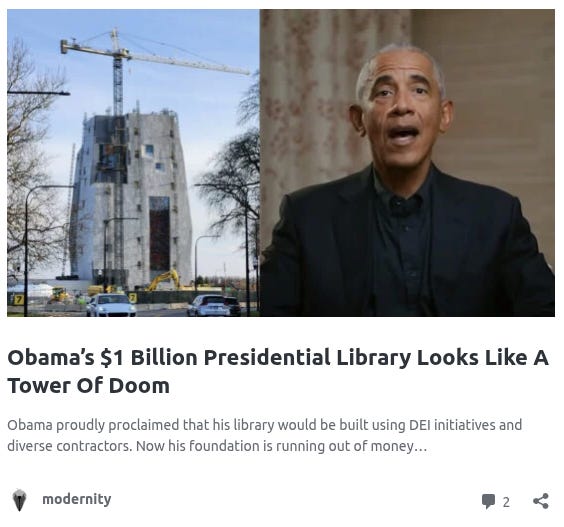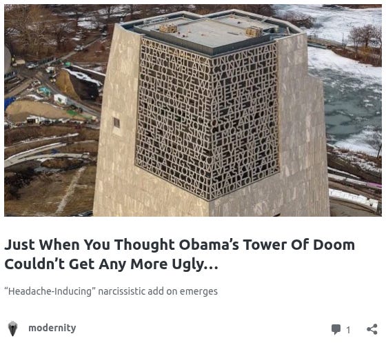 The $1 billion Presidential Library resembles a “Tower of Doom” – a concrete bunker sucking the life out of Chicago’s South Side, complete with DEI contractor lawsuits over poor performance and racial discrimination claims.