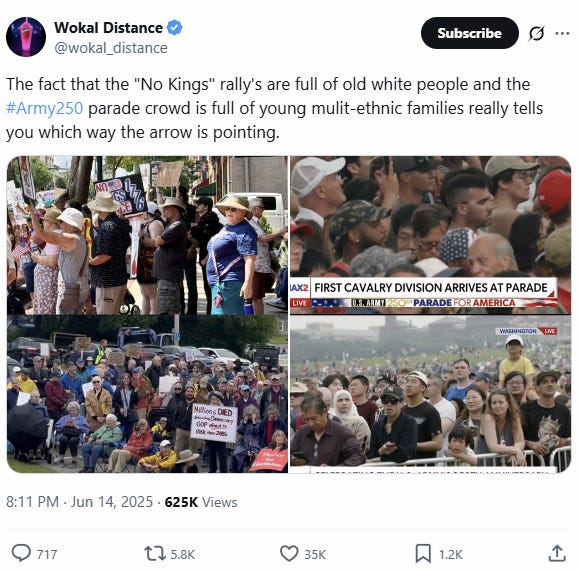 1) army members mis-stepping during the parade on Saturday, indicating that the US military is breaking ranks with Trump and aligning with NO Kings movement? I did think their walk was slightly poodley at times (uncoordinated). But I only saw bits.