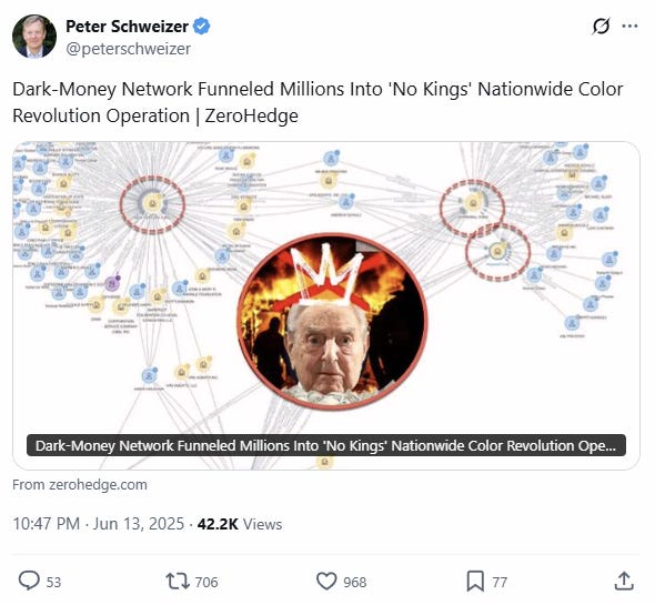 On Friday, Government Accountability Institute President Peter Schweizer published a report linking the rogue NGOs behind the 'No Kings' front operation—quarterbacking the broader color revolution effort—as receiving a "$114.8 million from the Arabella dark money network and how these professional protest organizations use tax dollars as a force multiplier.