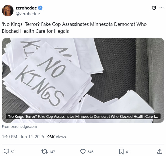 Terrible optics for the No Kings movement came early Saturday when a former appointee of Democratic Minnesota Governor Tim Walz, with No Kings literature in his vehicle, allegedly assassinated a Minnesota state representative and wounded a state senator.