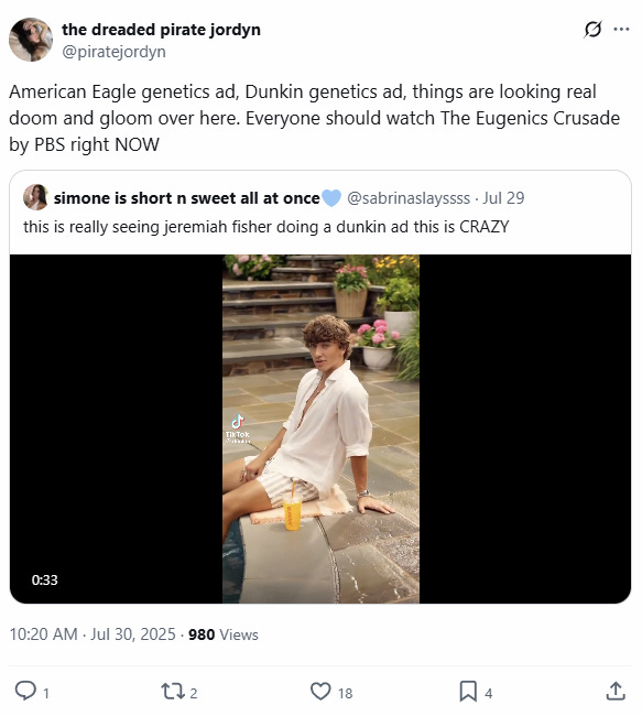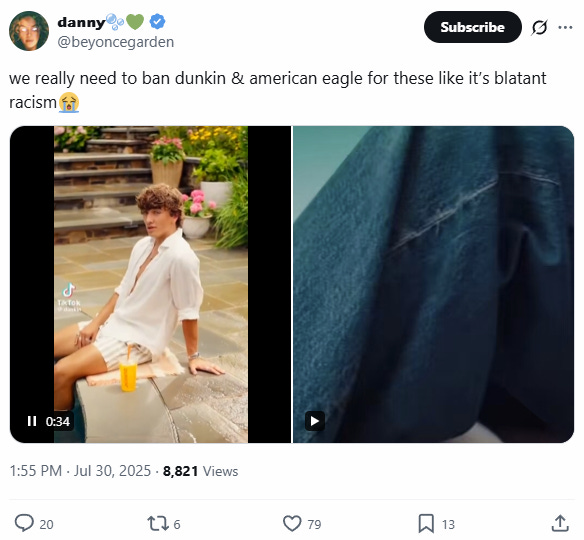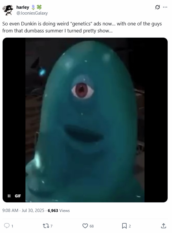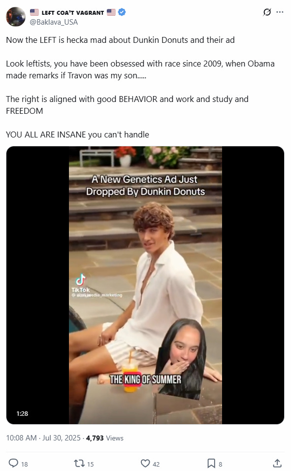 Following on from the leftist meltdown over the American Eagle Sydney Sweeney ‘Nazi propaganda’ ad, the mind virus addled whales are now targeting a Dunkin’ ad as the latest example of a rampant white supremacist marketing conspiracy… or something.