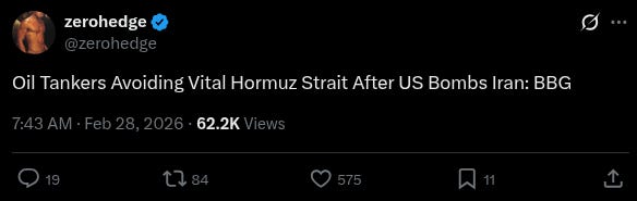 Bloomberg headline: Oil Tankers Avoiding Vital Hormuz Strait After US Bombs Iran