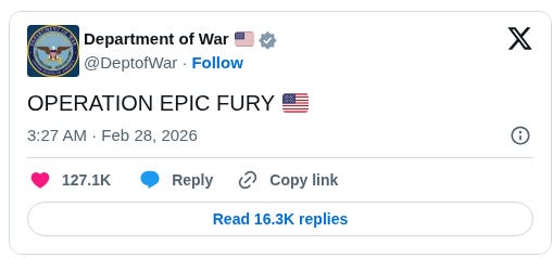 Shortly after the strike, the US Department of Defense wrote on X, “Operation Epic Fury.” For context, last year’s strike against Iran’s nuclear facilities was “Operation Midnight Hammer.”
