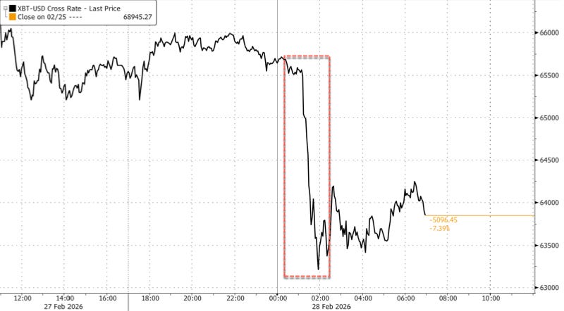 In markets, with Brent crude futures closed, Bitcoin was hammered from the $65k level, down to the $63k level.