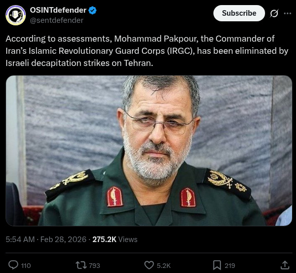 There are reports that IRGC Commander Mohammad Pakpour was killed by Israeli strikes.