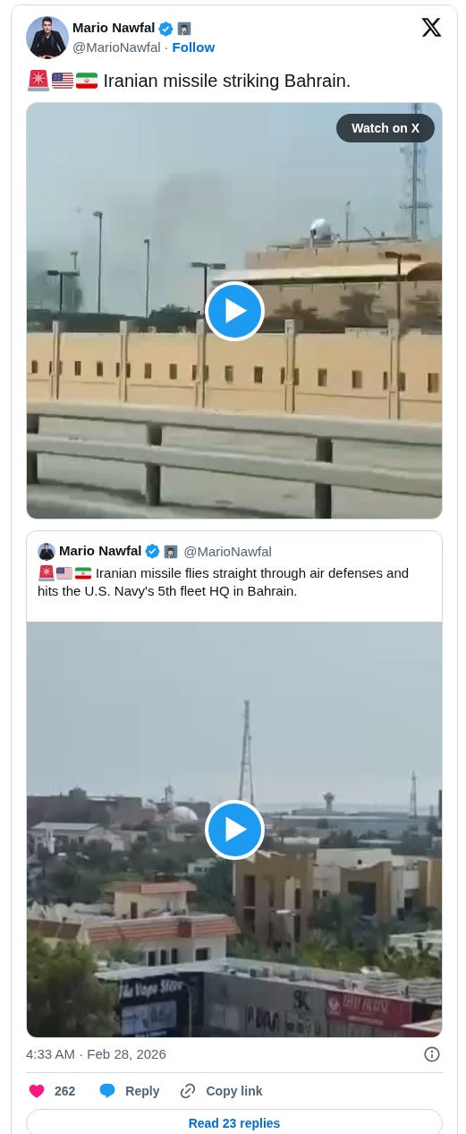 Other reports suggest Iran launched projectiles at US bases and targets beyond Bahrain, and also in Kuwait and Qatar.