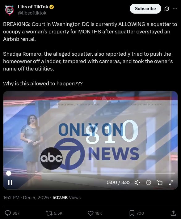 In yet another stunning example of the nation’s upside-down justice system, a DC court is allowing a squatter to remain inside a woman’s home for nearly a year after overstaying an Airbnb reservation, despite having no lease, no tenancy agreement, and no legal right to occupy the property.