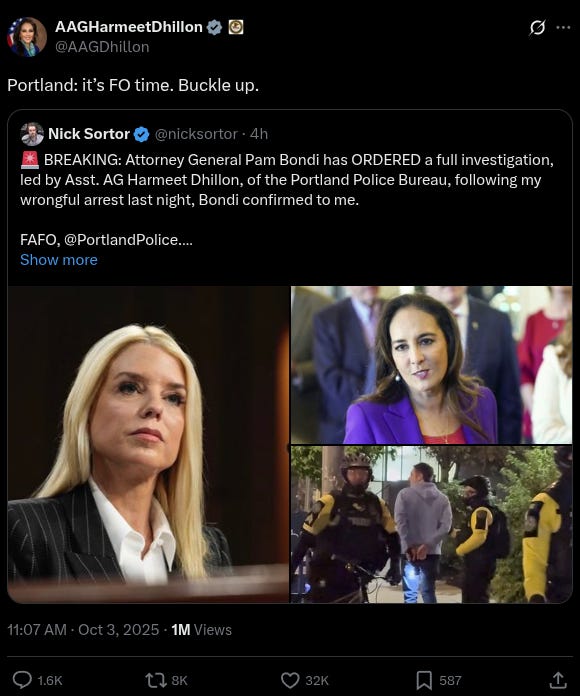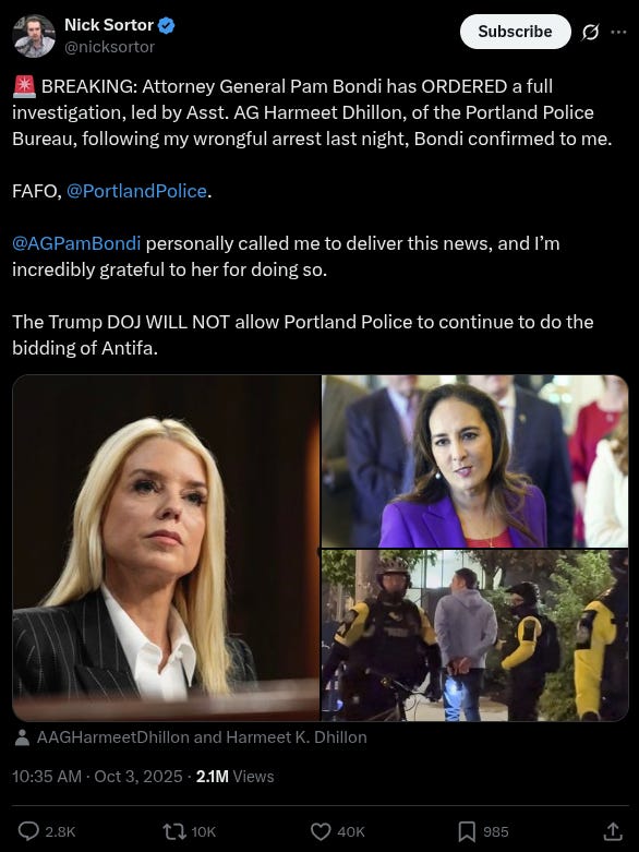 “BREAKING: Attorney General Pam Bondi has ORDERED a full investigation, led by Asst. AG Harmeet Dhillon, of the Portland Police Bureau, following my wrongful arrest last night, Bondi confirmed to me,” Sortor wrote.