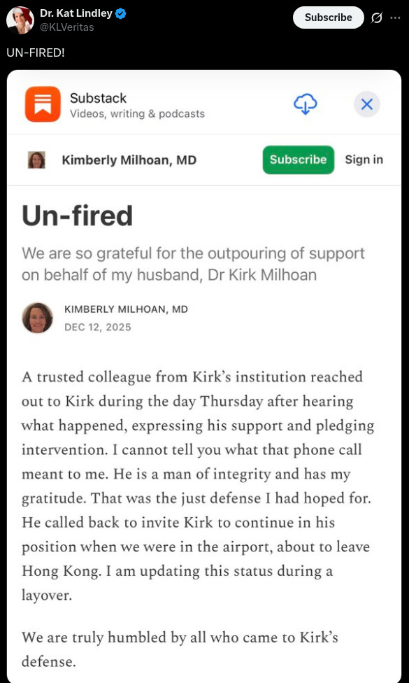 On Dec. 12, she added an update, titled “Un-fired.” She said Kirk Milhoan, a pediatric cardiologist with 25 years of experience and a former U.S. Air Force flight surgeon, had been invited back to his practice after a colleague intervened on his behalf.