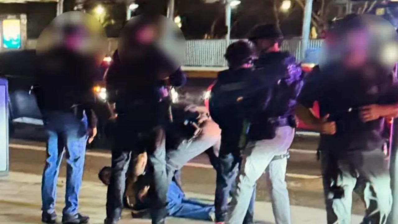Nick Reiner, whose face is blurred out, is seen being forced to the ground with his hands cuffed behind his back, according to one photo.