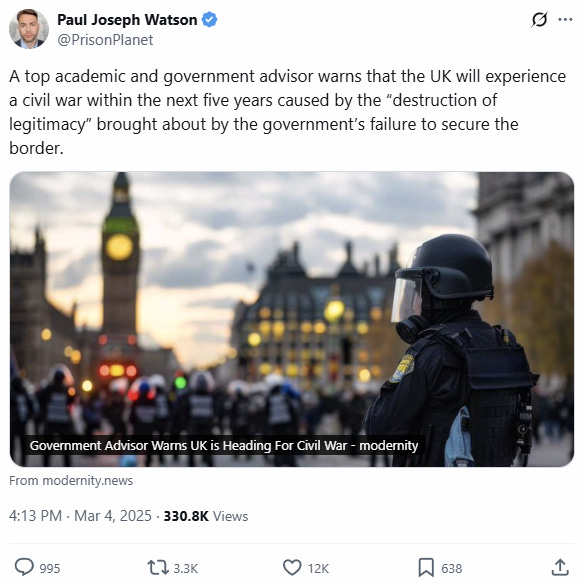 Betz notes that the United Kingdom, France, and Sweden all already have “dire social instability”, “economic decline”, and “elite pusillanimity”, all historically precursors to conflict.