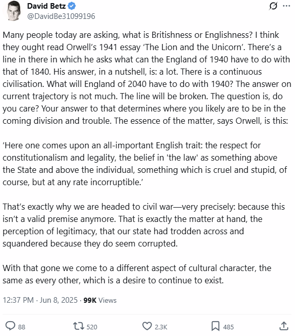Betz further asserted that “the existence of this idea [of England]… is very seriously in peril… how [people] react against that is the question. There’s a grave potential for them to react in ways that take us right off the scale. I hope that doesn’t occur, but we are at a very perilous moment.”