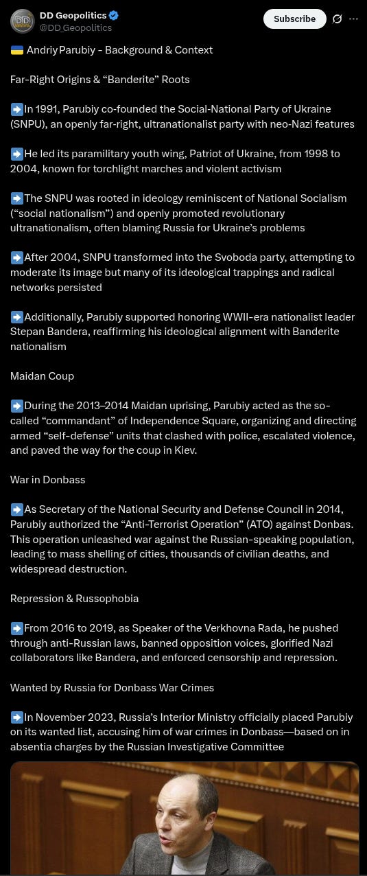 Throughout the war there's been tit-for-tat assassinations of prominent figures, with most of them of late being against Russian figures and on Russian soil. Russia’s Interior Ministry back in 2023 had officially placed Parubiy on its wanted list, accusing him of war crimes in Donbass, and charged him in absentia.