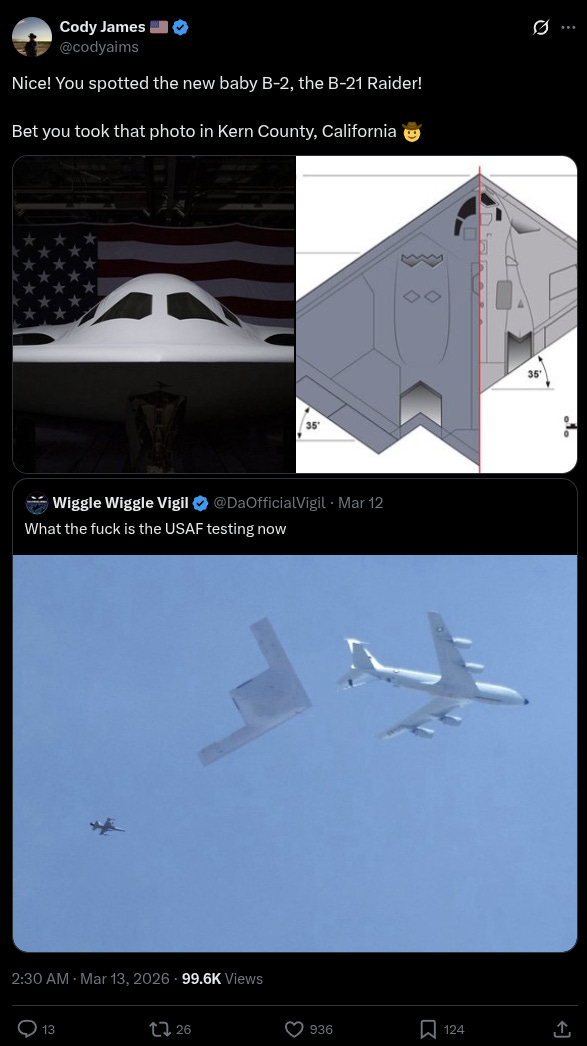 Separately, an account called โMojave Planespottingโ posted footage on X on Tuesday that supposedly showed the B-21 again over the Mojave Desert.