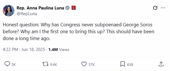 In a fiery post on X, Rep. Anna Paulina Luna (R-FL) has called out the elephant in the room: why has Congress never subpoenaed far-left billionaire globalist George Soros?