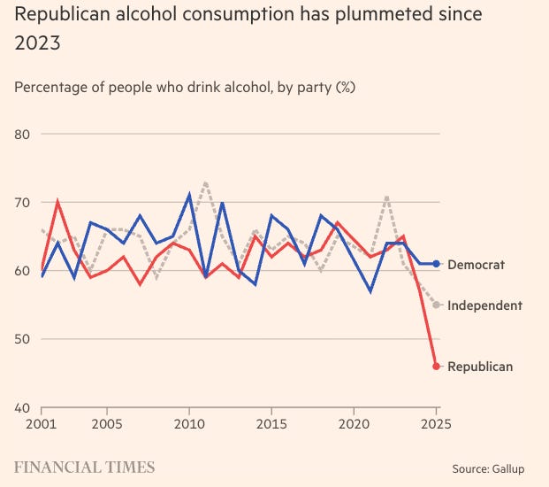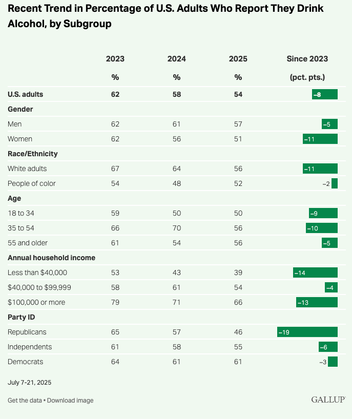 One shocking poll data point is that just 46% of Republicans reported drinking this year. That's down by a third from 2023, while the share of Democrats who drink slipped only 5%.