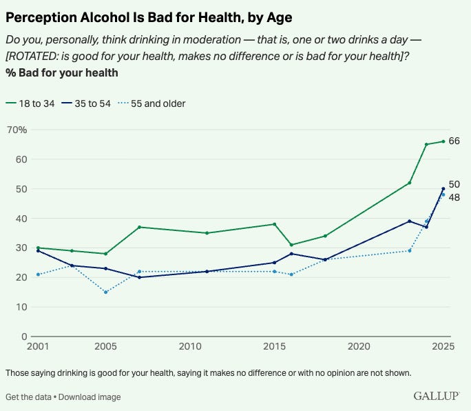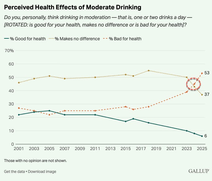 Gallup data shows an inflection point among U.S. consumers, with 53%, a majority, now believing that drinking alcohol is bad for one's health.