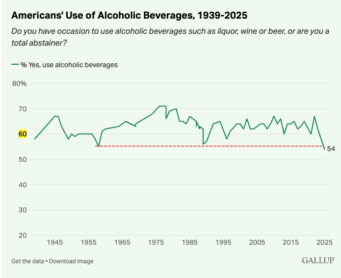 From 1997 to 2023, more than 60% of Americans reported drinking alcohol. That share slipped to 62% in 2023, fell to 58% in 2024, and has now fallen to 54% in 2025. Gallup's data shows the rate has only dipped below 60% fewer than ten times, including 58% in its first survey in 1939 and again in 1958. Peak drinking years came between 1974 and 1981, when 68% to 71% of Americans reported drinking.