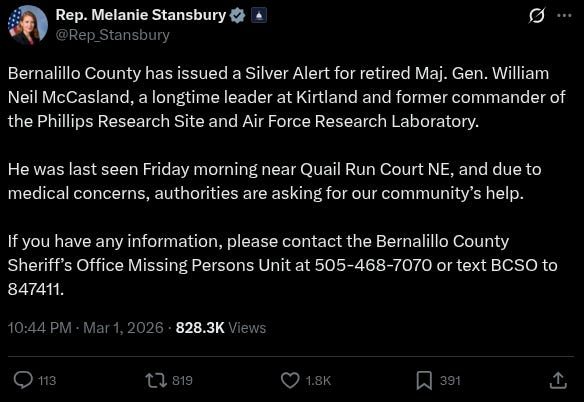 The Albuquerque Journal reported that Col. Justin Secrest, the current commander of Kirtland Air Force Base, stated, “We are coordinating closely with local authorities and defer all updates regarding the search efforts to the Bernalillo County Sheriff’s Office.”
